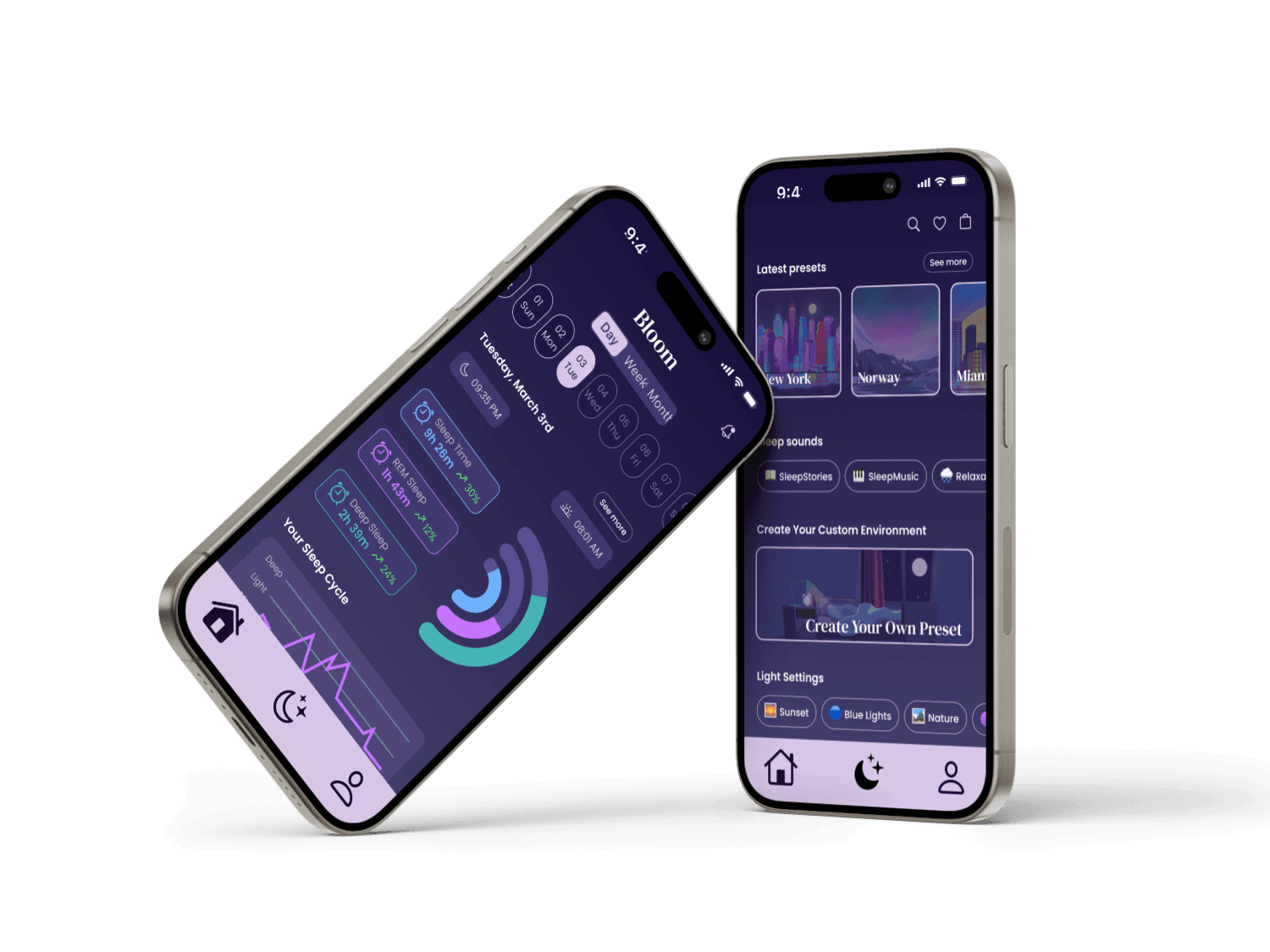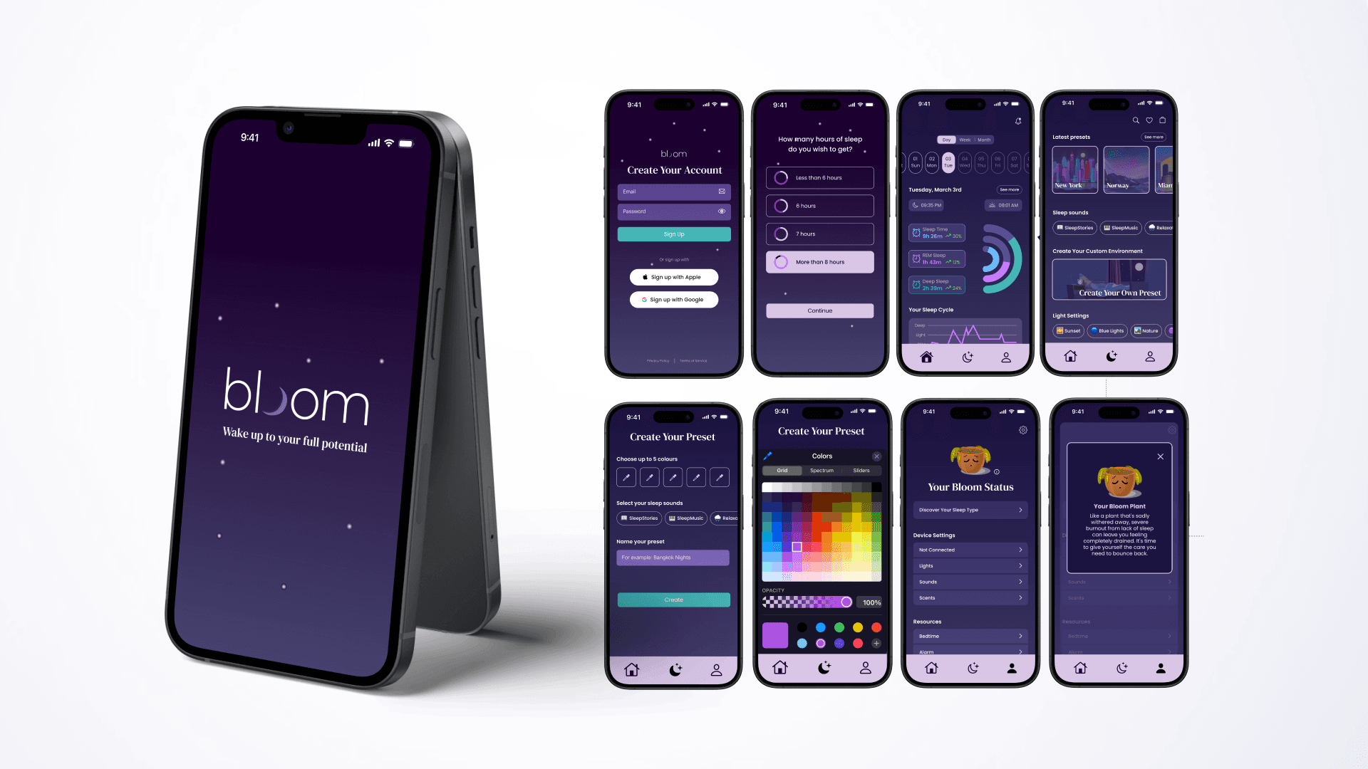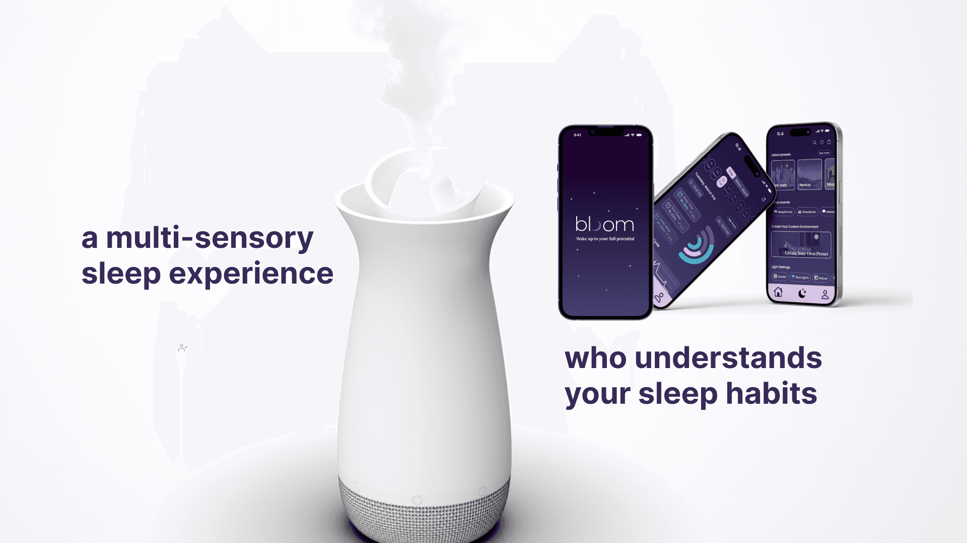 Bloom - a multi-sensory sleep solution designed to help time-conscious individuals achieve quality sleep. A bedside device and mobile app that work together to create a personalized sleep environment.